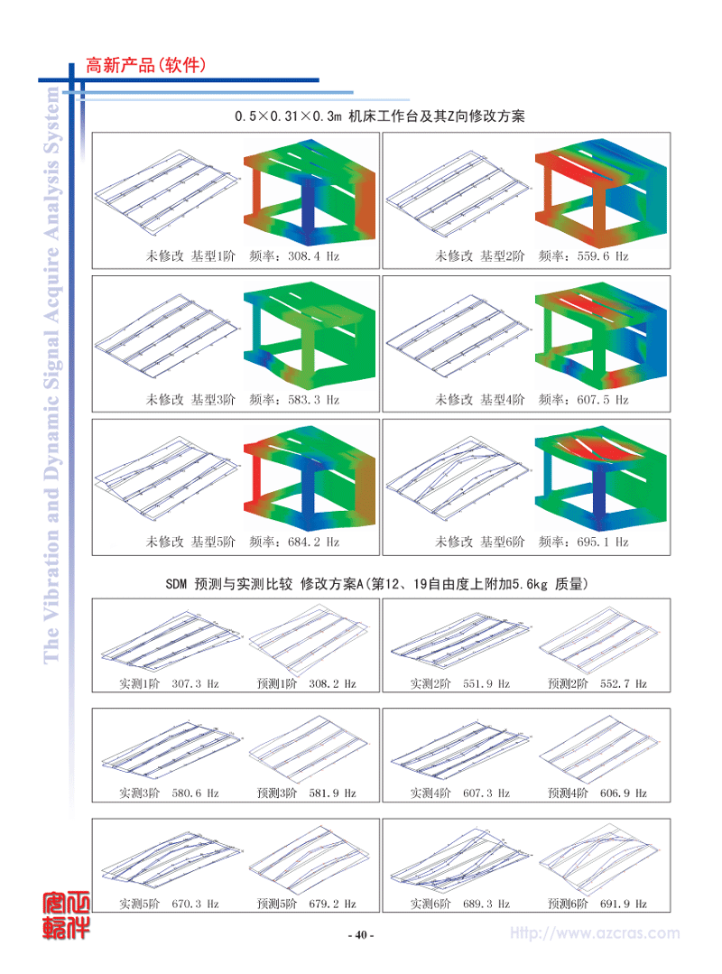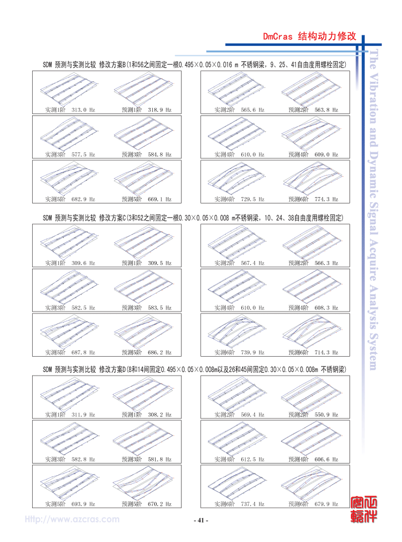 结构动力修改:良好的愿望和工程应用可能。结构动力修改(SDM)是设计师期待多年的愿望。结构动力修改的正问题和反问题,如果封闭在有限元计算模型内解决, 其正问题是很方便的,只要改变单元类型、划分和材料特性等参数重新计算一次就可以,现在已大量应用于计算机辅助设计。其反问题就是特征值的反问题,由于物理性质上的特点及数学工具的难度较大,目前在理论上还不完善。由于材料特性、构件结合面及非线性等因素,根据计算的各种方案得到的动力特性变化规律必须经过试验验证。通常所指的SDM 是指在试验模态分析基础上的,即根据已完成的模态试验建立的动力学模型,预测结构进行某种修改后动力特性应有的变化(正问题)或为了得到改进的动力特性应对结构作何种允许的修改(反问题)。