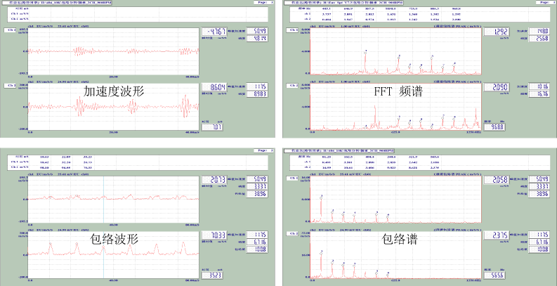 Env_Spt 包络谱分析程序 可同时对不同部位或不同方向共1、2或4个加速度计测量的齿轮箱、滚动轴承振动信号采集、波形显示、FFT 频谱显示、Hilbert 变化包络波显示以及包络谱分析。根据需要对实测的加速度信号进行数字低通或带通滤波。在获得包络波形和包络谱同时可得到加速度信号的峰值、峭度以及表征故障信号调制深度的包络谱值。