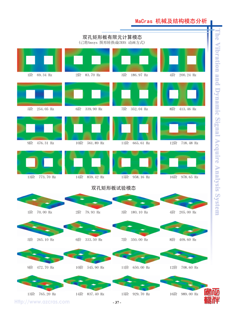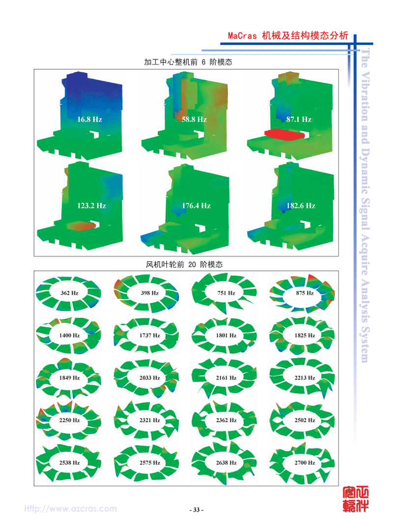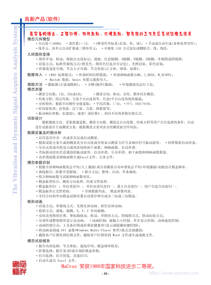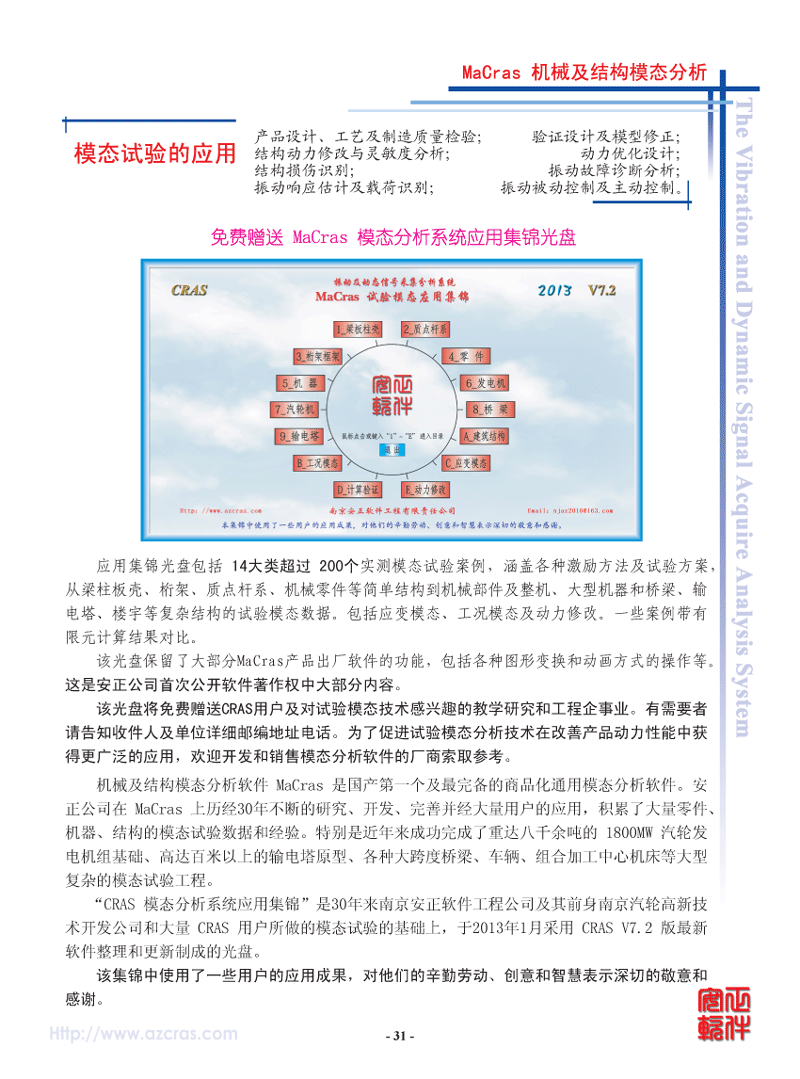 - 模态理论:实模态、复模态。采用CRAS独创的成功应用各种大量机器及结构25年的自动整体参数识别方法,毋须人工干预,操作简便,结果可靠。