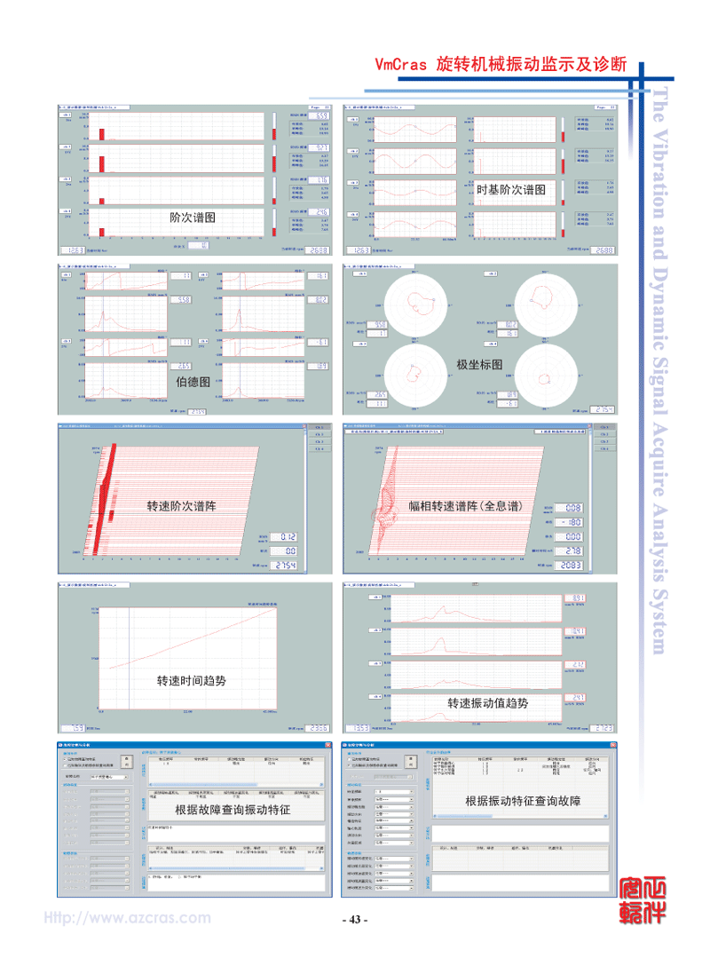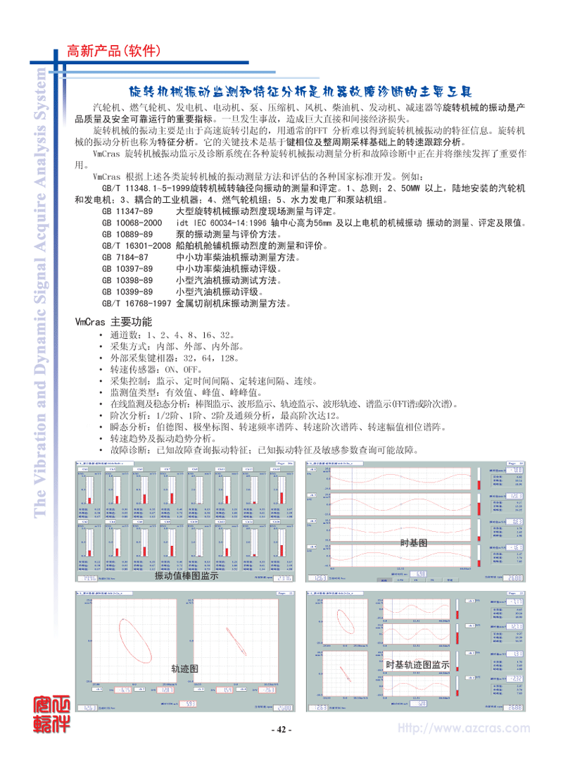 VmCras 根据上述各类旋转机械的振动测量方法和评估的各种国家标准开发。例如: GB/T 11348.1~5-1999 旋转机械转轴径向振动的测量和评定。1 总则,250MW 以上,陆地安装的汽轮机和发电机,3 耦合的工业机器,4 燃气轮机组,5 水力发电厂和泵站机组。
